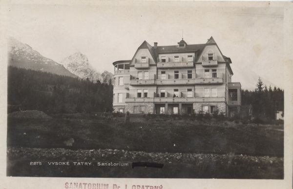 Widok na budynek sanatorium Doktora Opatrného w miejscowości Stary Smokowiec. W tle Pośrednia Grań. Na dole wpisany tytuł, poniżej na marginesie pieczątka Sanatorium Dr. Opatrného.