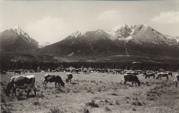 Stado krów na pastwisku. W tle Sławkowski Szczyt, Łomnica i Kieżmarski Szczyt.