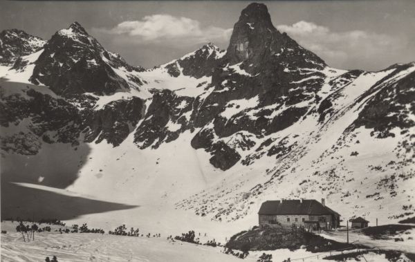 Schronisko przy Zielonym Stawie Kieżmarskim w zimie. W tle Baranie Rogi, Czarny Szczyt, Kołowy Szczyt i Jastrzębia Turnia.