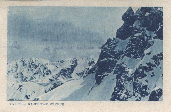 Zimowy widok z Kasprowego Wierchu na Żółtą Turnię i Kościelec. Pod zdjęciem drukowany tytuł: TATRY - KASPROWY WIERCH.