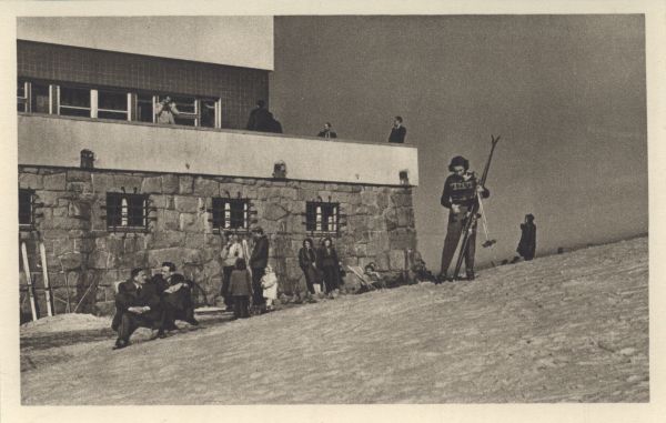 Narciarze i turyści przed hotelem górskim na Kalatówkach.
