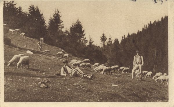 Pasterze z owcami na hali w Pieninach.