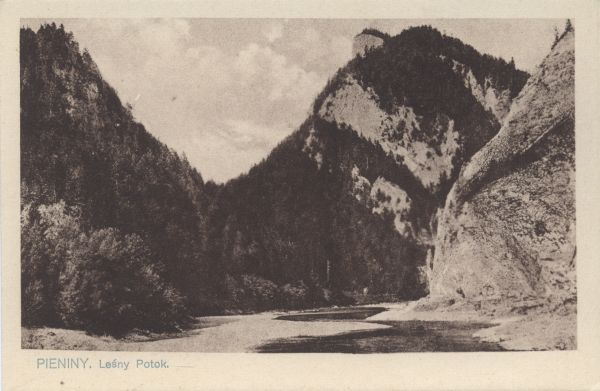 Dunajec w Pieninach. Pod zdjęciem drukowany tytuł: PIENINY. Leśny Potok.