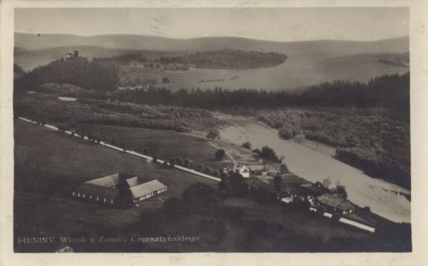 Widok z Zamku Czorsztyńskiego na Czorszyt. Na dole zdjęcia po lewej stronie napisany tytuł: PIENINY. Widok z Zamku Czorsztyńskiego.