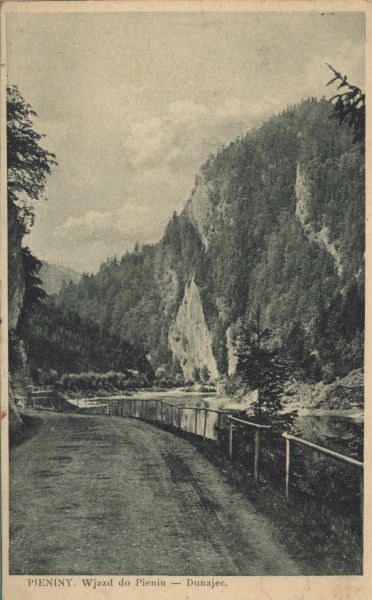 Droga Pienińska nad Dunajcem. Pod zdjęciem drukowany tytuł: PIENINY. Wjazd do Pienin - Dunajec.