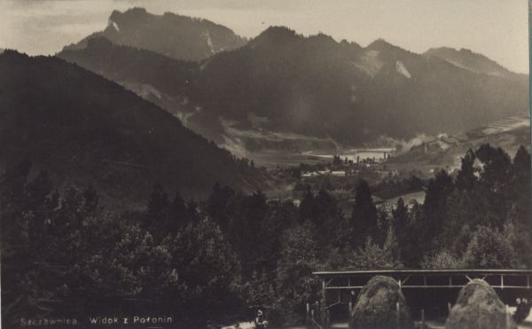 Widok na Szczawnicę z Połonin. Na dole tytuł.