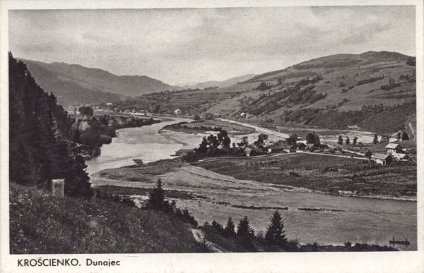 Widok ogólny na Krościenko i Dunajec. Pod zdjęciem tytuł: KROŚCIENKO. Dunajec.