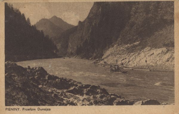 Przełom Dunajca w Pieninach. Na rzece płyną tratwy z turystami. Pod zdjęciem drukowany tytuł: PIENINY. Przełom Dunajca.