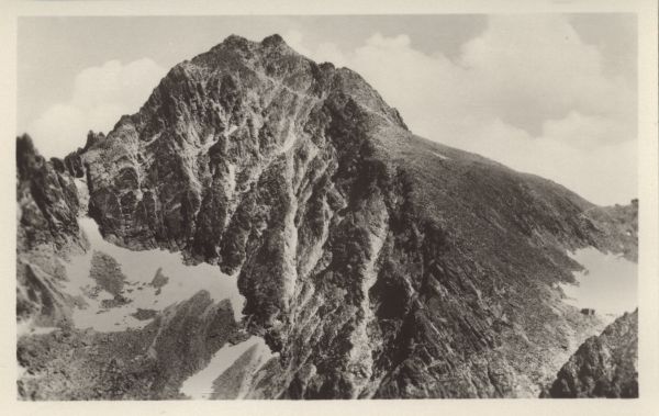 Rysy i przełęcz Waga. Z prawej widoczne schronisko pod Rysami w kotlince pod Wagą.