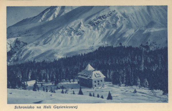 Schronisko Murowaniec na Hali G±sienicowej w zimie. Pod zdjęciem drukowany tytuł: Schronisko na Hali G±sienicowej.