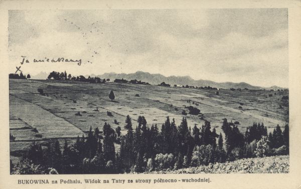 Widok na Tatry Wysokie z Bukowiny Tatrzańskiej. Pod zdjęciem drukowany tytuł: BUKOWINA na Podhalu. Widok na Tatry ze strony północno - wschodniej.