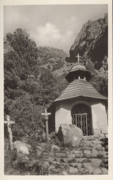 Kapliczka i drewniane krzyże na Symbolicznym cmentarzu pod Osterwą w Dolinie Mięguszowieckiej.