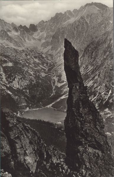 Basztowa Igła w Skrajnej Baszcie. Widok na Popradzki Staw i Dolinę Złomisk, nad nimi Kończysta.