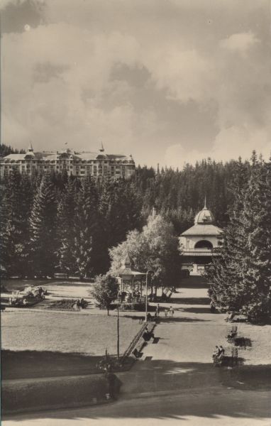 Park zdrojowy w Tatrzańskiej Łomnicy. Z prawej łaźnia. W tle Grand Hotel Praga.