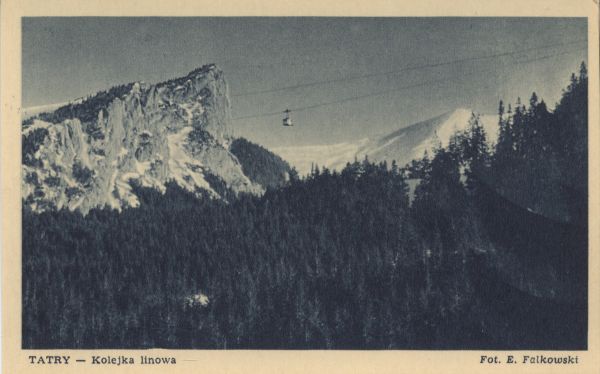 Kolej linowa na Kasprowy Wierch. Z lewej Zawrat Kasprowy. Pod zdjęciem drukowany tytuł: TATRY - Kolejka linowa. Fot. E. Falkowski.