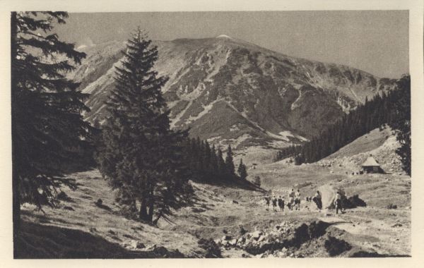 Turyści wędrujący na Halę Kondratową. Z prawej widoczne schronisko. W tle Kondracka Kopa.