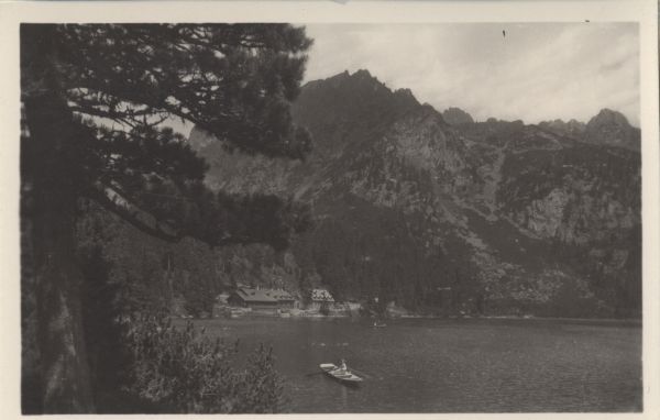 Schronisko nad Popradzkim Stawem w Dolinie Mięguszowieckiej. Na stawie łódka. W tle Popradzka Kopa.