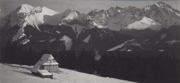 Panorama Tatr Bielskich i Tatr Wysokich z Bukowiny Tatrzańskiej w zimie.