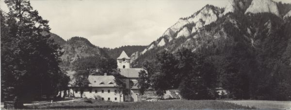 Budynki klasztorne w Czerwonym Klasztorze. W tle z prawej Trzy Korony.