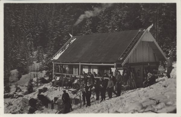 Grupa turystów i żołnieży przed Schroniskiem Bilíka pod Siodełkiem.