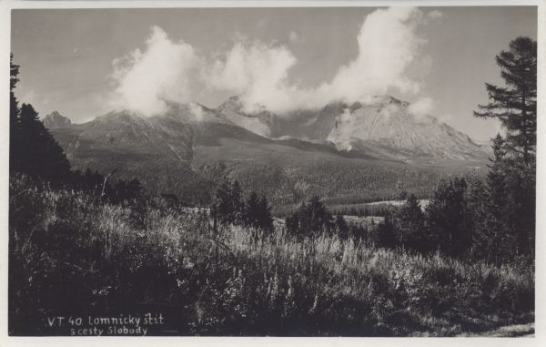 Widok na grupę Łomnicy w chmurach. Na dole zdjęcia opis: V.T. Lomnický ątít s cesty Slobody.