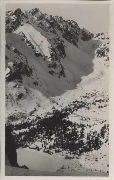 Widok na Dolinę Mięguszowiecką z Osterwy w zimie. W dole Popradzki Staw ze schroniskiem nad brzegiem. W tle Szatan. Brak opisu.