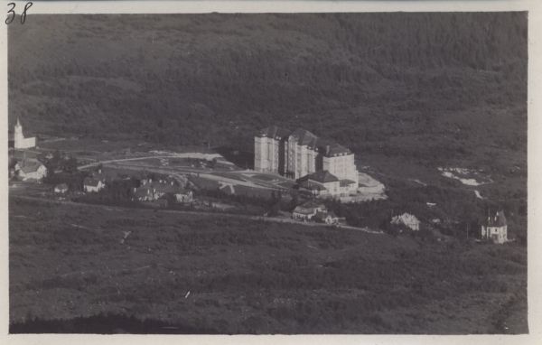 Widok ogólny na Nowy Smokowiec. Z lewej kościół, pośrodku sanatorium. Brak opisu.