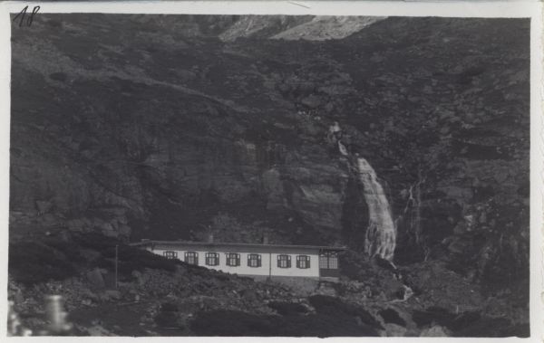 Schronisko Śląski Dom w Dolinie Wielickiej. W tle Wielicka Siklawa. Brak opisu.