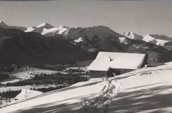 Panorama Tatr Zachodnich z Kościeliska zimą.