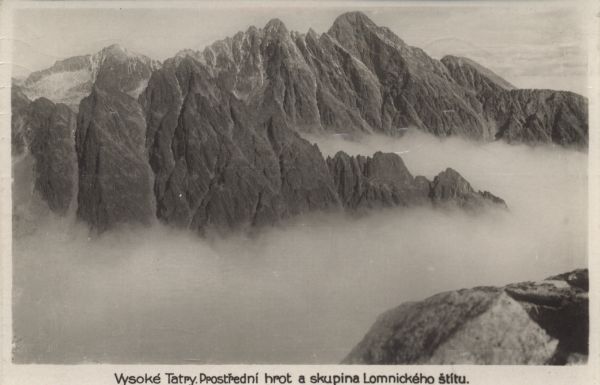 Pośrednia Grań w morzu mgieł. W tle Hawrań, Durny Szczyt i Łomnica. Pod zdjęciem opis: Vysoké Tatry. Prostřední hrot a skupina Lomnického štítu.