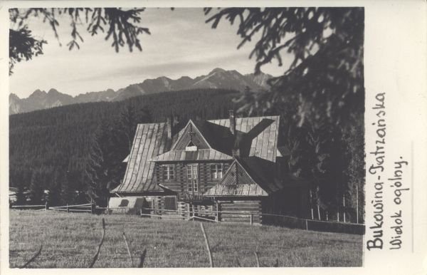 Drewniany dom w Bukowinie Tatrzańskiej. W tle szczyty Tatr Wysokich. Po prawej stronie obok zdjęcia opis: Bukowina - Tatrzańska. Widok ogólny.