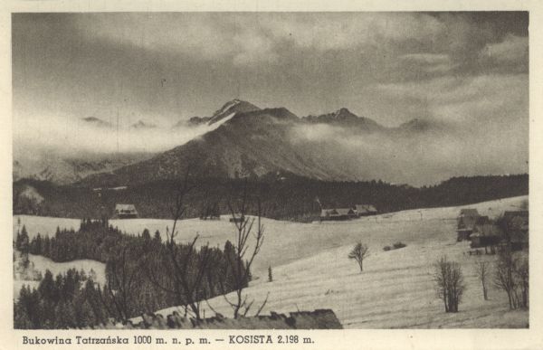 Bukowina Tatrzańska w zimie. W tle Koszysta. Pod zdjęciem drukowany tytuł: Bukowina Tatrzańska 1000 m. n.p.m. - KOSISTA 2.198 m.