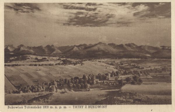 Panorama Tatr Wysokich z Bukowiny Tatrzańskiej. Pod zdjęciem drukowany tytuł: Bukowina Tatrzańska 1000 m. n.p.m. - TATRY Z BUKOWINY.