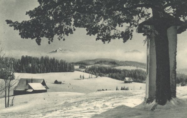 Buńdów Wierch w Bukowinie Tatrzańskiej zimą. Z prawej pod drzewem kapliczka przydrożna. W tle w chmurach szczyt Łomnicy.