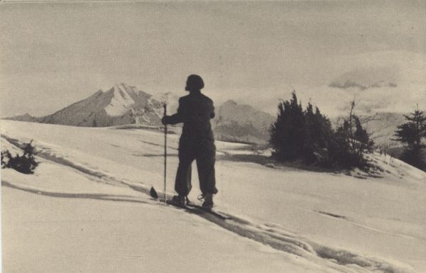 Narciarz w Bukowinie Tatrzańskiej zimą. W tle Hawrań.