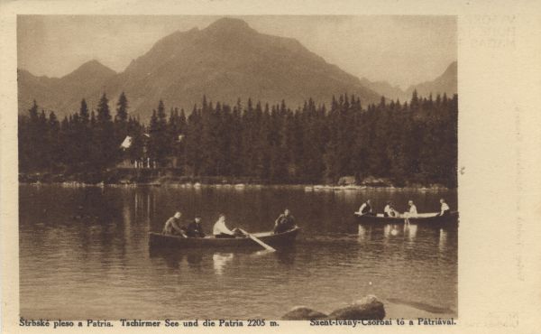 Łodzie z turystami na Szczyrbskim Jeziorze. W tle Skrajna Baszta. Pod zdjęciem wydrukowany tytuł, także w języku: niem. i węg.
