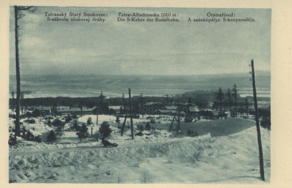 Zimowa droga saneczkowa z Siodełka do widocznego w dole Starego Smokowca. U góry zdjęcia drukowany tytuł: Tatranský Starý Smokovec: S-zákruta sánkovej dráhy. (także w jęz.: niem. i węg.)