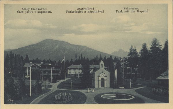 Kapliczka w parku zdrojowym w Starym Smokowcu. W tle Sławkowski Szczyt i Łomnica. U góry drukowany tytuł, również w języku węgierskim i niemieckim.