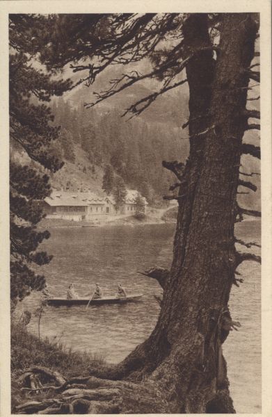Schronisko nad Popradzkim Stawem w Dolinie Mięguszowieckiej. Na wodzie widoczna łódka z turystami.