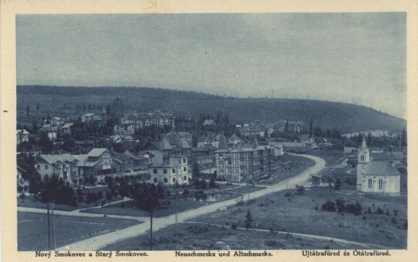 Widok ogólny na Nowy Smokowiec i Stary Smokowiec. Pod zdjęciem drukowany tytuł, również w języku niemieckim i węgierskim.