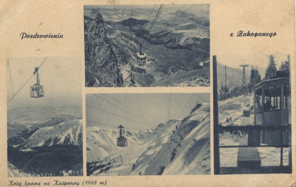 Pocztówka 4 elementowa: Kolej linowa na Kasprowy Wierch. Napis: Pozdrowienia z Zakopanego. Na dole drukowany tytuł.