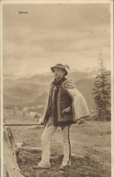 Portret młodego górala na tle panoramy Tatr. U góry drukowany tytuł.