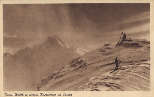 Widok ze szczytu Kasprowego na Świnicę w zimie. Na pierwszym planie narciarze. Pod zdjęciem drukowany tytuł.