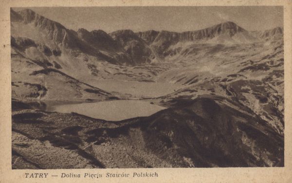 Widok na Dolinę Pięciu Stawów Polskich ze Świstówki Roztockiej. W tle Liptowskie Mury i Gładki Wierch. Pod zdjęciem drukowany tytuł: TATRY - Dolina Pięciu Stawów Polskich.