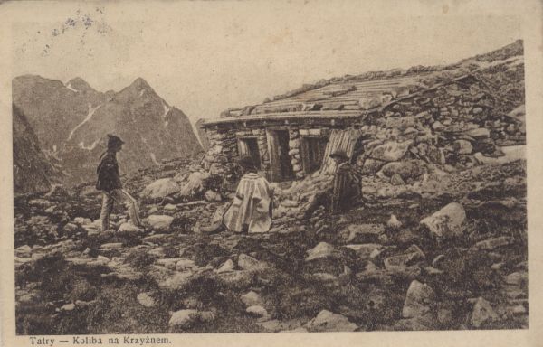 Górale przed schroniskiem na Krzyżnem. Pod zdjęciem drukowany tytuł.