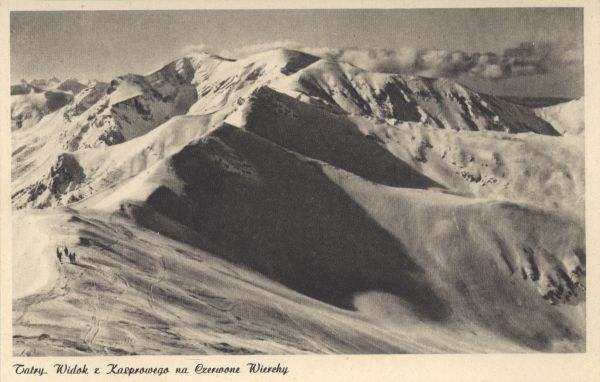 Widok z Kasprowego Wierchu na Czerwone Wierchy w zimie. Pod zdjęciem wydrukowany tytuł.