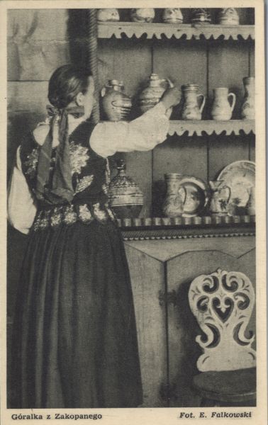 Góralka we wnętrzu chałupy. Pod zdjęciem drukowany opis: Góralka z Zakopanego. Fot. E. Falkowski.