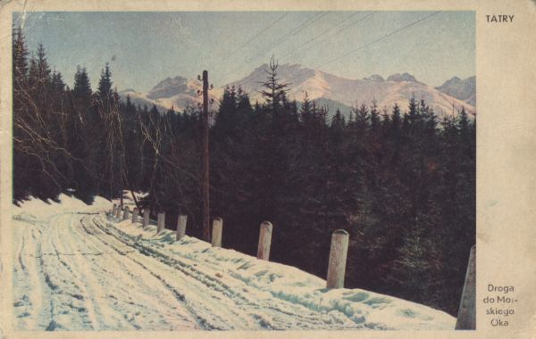 Droga do Morskiego Oka w zimie. Na marginesie wydrukowany tytuł.