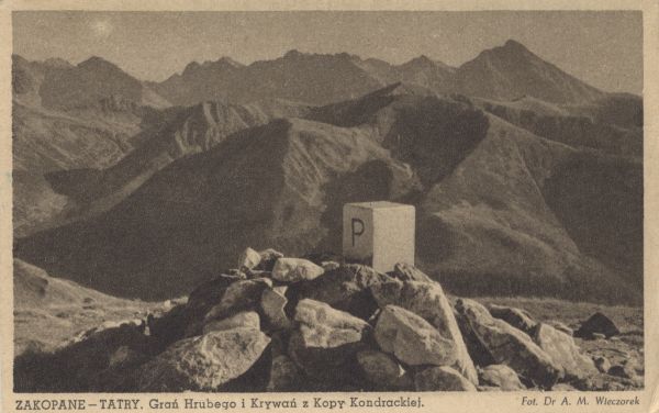 Widok z Kondrackiej Kopy. Od lwej: Koprowy wierch, Szczyrbski Szczyt, Hruby Wierch, Krywań. Pośrodku Wielka Kopa Koprowa, z lewej Dolina Wierchcicha. Pod zdjęciem wydrukowany tytuł i nazwisko fotografa.