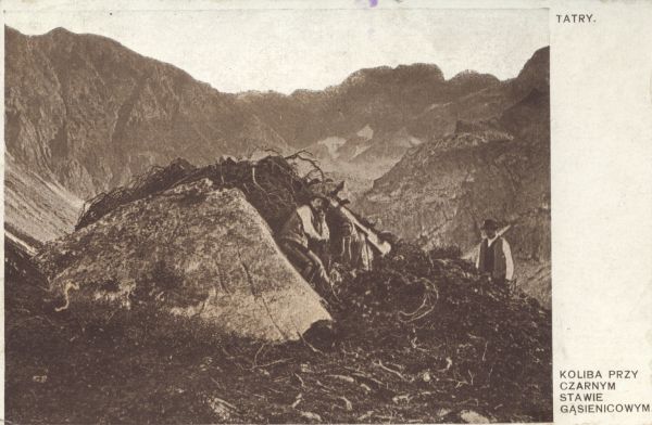 Koliba nad Czarnym Stawem G±sienicowym. U wej¶cia przewodnik z kobiet±, obok stoi mężczyzna. W tle Kozi Wierch. Na marginesie po prawej strony drukowany tytuł.